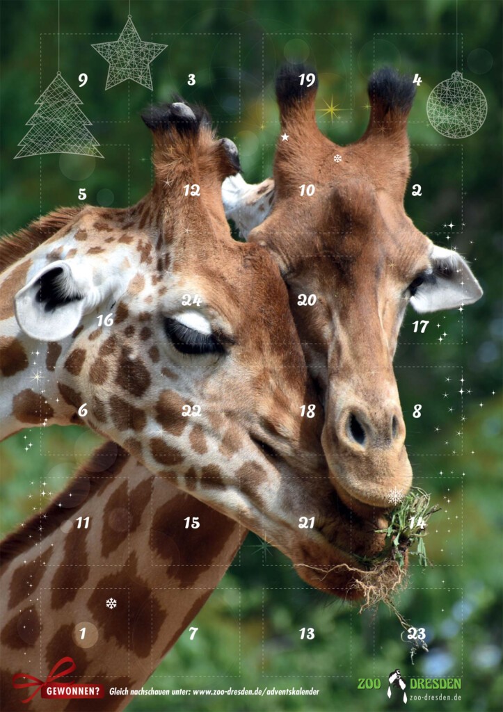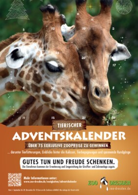 Mit dem Kauf unseres Adventskalenders unterstützen Sie nicht nur die Erweiterung der Giraffen- und Zebraanlage. Mit ein wenig Glück gewinnen Sie auch exklusive Zooerlebnisse und tolle Zoo-Preise. Den Kalender gibt es noch bis 30. November an unserer Zookasse zu kaufen. Bei Übernahme der Versandkosten (4 Euro inkl. Material- und Bearbeitungskosten) schicken wir Ihnen den Kalender auch gern zu. Nutzen Sie dafür einfach unser Kontaktformular.