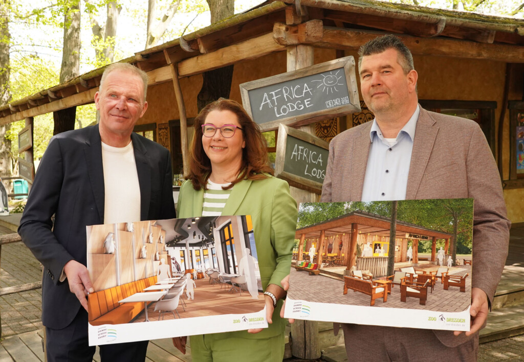 Beim heutigen gemeinsamen Pressetermin stellten Zoo-Geschäftsführer Karl-Heinz Ukena und die beiden Geschäftsführer der Weißen Flotte Sachsen GmbH Astrid Rockel und Stefan Bloch die Entwürfe und geplanten Umstrukturierungen an den beiden Gastronomie-Standorten vor. In das Pinguin Café sollen zwischen 600.000 – 800.000 Euro investiert werden, um dort die Sitzkapazität zu erhöhen und die Raum- und Platzgestaltung zu optimieren. Die Bestuhlung soll mehr zum Verweilen einladen und mehr die behagliche Stimmung eines Eiscafés erhalten. Während die Umbaumaßnahmen für das Pinguin Café erst Ende 2027 in Angriff genommen werden, soll die Africa Lodge bereits zum Jahresende 2026 komplett neu gebaut werden. Ziel ist, die neue Africa Lodge im neuen Gewand zum Saisonstart 2027 wieder zu eröffnen. Neben einer deutlich erhöhten Sitzkapazität wird es vor allem mehr überdachte Sitzplätze als bisher geben, um auch an regnerischen Tagen ein gastronomisches Angebot im Außenbereich anbieten zu können.